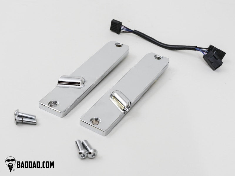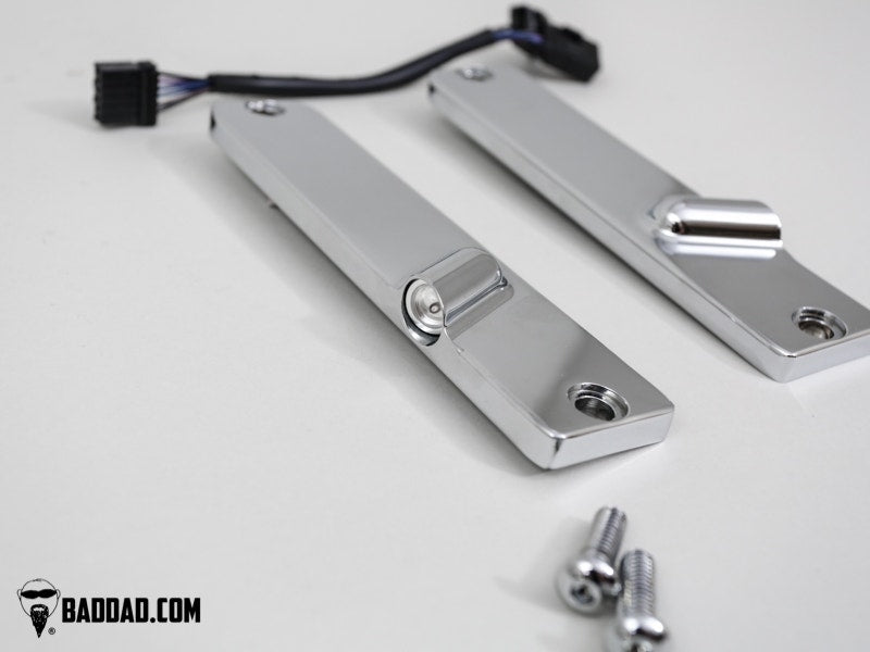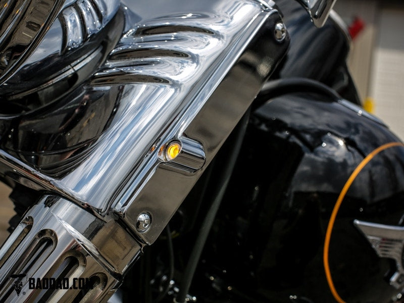 Bad Dad's 900 Series Turn Signals are a great way to drop the clunky turn signals off your Street Glide and Electra Glide. These custom signals completely eliminate the stock turn signal bar and replace it with this custom billet light which features a super bright LED.
