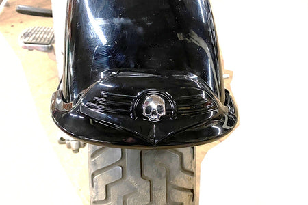 Front fender tip features a black finish with a chrome skull.