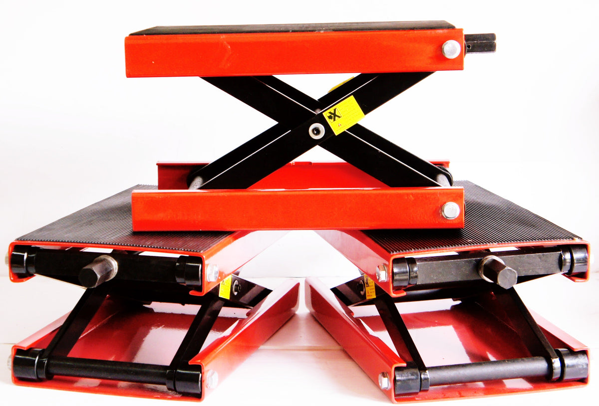 - Sturdy scissor jack for lifting motorcycles for service or cleaning