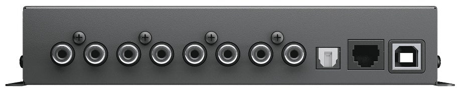 Hertz H8 DSP car audio processor is capable of interfacing with any analog and/or digital source, transforming ordinary “audio” into a high-performance integrated system. The simple and intuitive computer software ensures a wide array of adjustments to improve the acoustic response of a complex environment like the car compartment. It provides 7 signal inputs with a variety of connection options: four high-level inputs, also accepting low-level pre-amplified signals; a stereo auxiliary input and an optical digital input accepting signals at a sample rate up to 96/24 bit. The optical digital input (selectable through the DRC HE remote control and from the “Optical / AUX select” terminal) nullifies interferences and signal deteriorations also by-passing the analog signals A/D conversion stages. Thanks to the configuration Wizard provided by the software during the set-up, the H8 DSP can automatically sum up multiple filtered channels (for instance, woofer plus tweeter), “flatten” the OEM source equalized response curve and reconstruct a centre, rear and/or subwoofer channel with a simple stereo input. By reading the test track on the CD provided, the H8 DSP recreates a full-bandwidth signal, with a flat frequency response and released after processing for an outstanding sound quality. The H8 DSP features 8 PRE OUT analog outputs each of them including: a 31 band equalizer, a 68 step electronic crossover, Linkwitz- Riley or Butterworth filters with selectable 6 – 24 dB adjustable slopes and digital time delay functions.