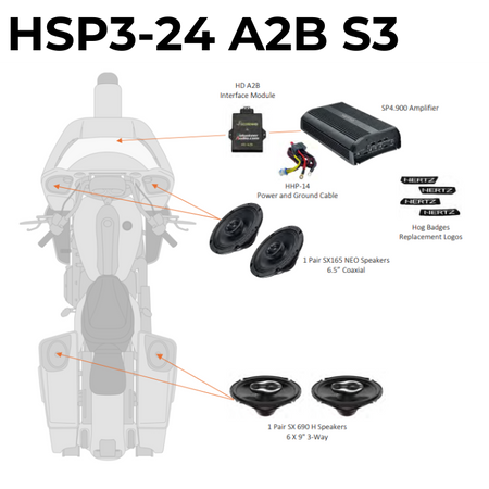 2024 A2B (for bikes equipped with Factory Stage 3 audio package) 4 Speaker Kit with HD A2B Module, SP4.900 amplifier, SX165 NEO Coax Speakers, SX690 H Coax Speakers, HHP14 Power and Ground Cable and Hog Badges for front and rear speaker grills.