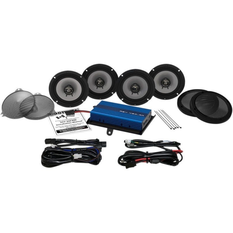 - Complete front and rear speaker kit with 4-channel amp