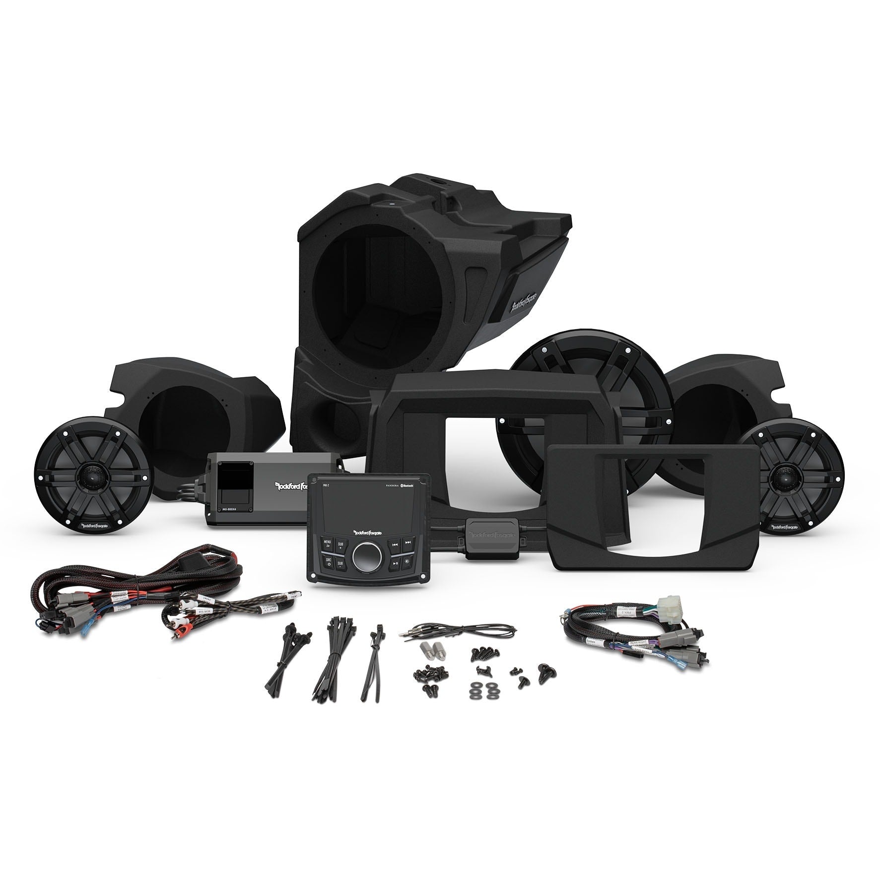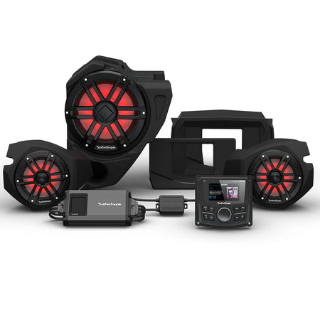 This Rockford Fosgate audio kit is Color Optix™ enabled by featuring our Color Optix™ controller to allow color adjustment of speakers and rear moto-cans. Audio system is 100% Element Ready™ solution and provides ability to take your off-road vehicle into any environment. Amplifier employs Rockford Fosgate preset for easy set up allowing maximum performance without any tuning. System features a plug and play design, does not require any cutting or drilling of vehicle, step by step install videos available.