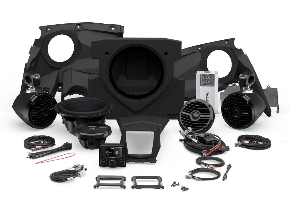 The Stage 4 kit is the complete package that combines the Stage 3 kit with Rockford Rosgate's rear speaker option. Adding the RM1 series mini speaker enclosure and clamp system, this kit adds the last bit of sound that you need. Simply plug in the harness, mount the speakers and rock out. Whether hitting the dunes or the trails, you are sure to be the center of attention of any get-together. Compatible with factory equipped Smart-Lok module.