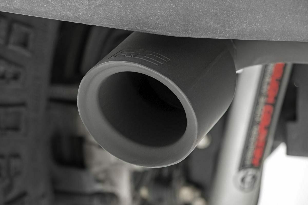 Overhaul the look and sound of your JKs exhaust with Rough Country's Dual-Outlet Performance Exhaust System. Available in polished stainless steel or matte black stainless steel finish, these durable exhaust systems offer a throaty growl and menacing appearance that fits in perfectly with the aggressive look of a modified Jeep. Each exhaust system features a 409 stainless body with high temperature resistant coating for a long lifespan of good looks. This high-quality exhaust modification features 21/2" mandrel-bent tubing that's designed for a high-flow, guttural sound that every driver will enjoy. A set of dual-wall exhaust tips with embossed RC logo add a finishing touch to this great-looking upgrade, constructed from corrosion resistant 304 black stainless material. Rough Country's Dual-Outlet Performance Exhaust System is easy to install with no cutting or welding required!