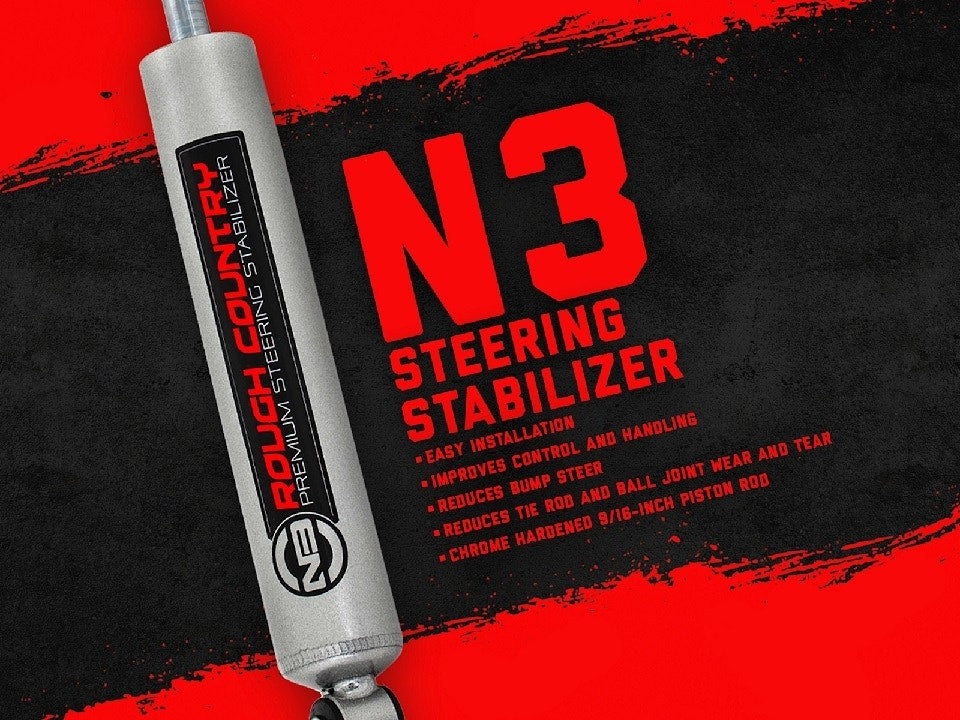 Steering stabilizers are designed to restrain "bump steering" and front end vibration, giving added life to tires, ball joints, and other steering components and are highly recommended for vehicles running aftermarket tires. The durable 18mm chrome hardened piston rod and large-bodied cylinder dwarfs factory equipment, ensuring a more effective vibration damping each and every time you take to the trails. Rough Country's N3 Steering Stabilizer kit is easy to install, with a 100% bolt-on installation process that can be installed in a home garage with common tools