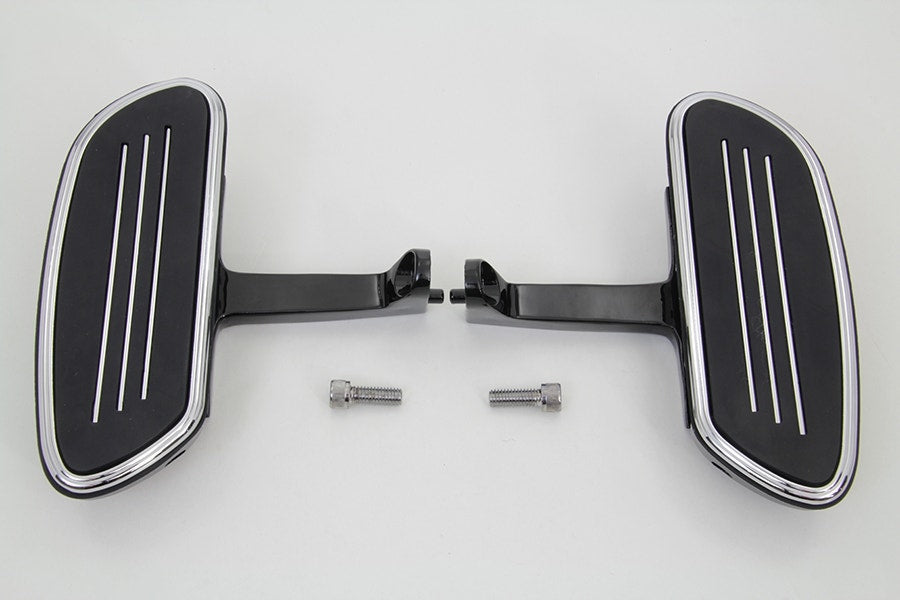 Streamliner passenger footboard set includes aluminum footboards with a chrome finish, rubber pads, black mounting hardware and instructions. Set has a black rubber pad with three chrome bands.