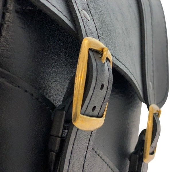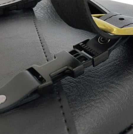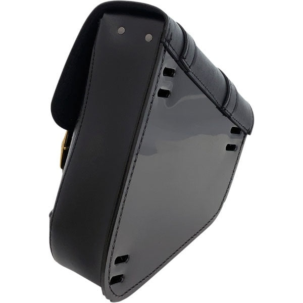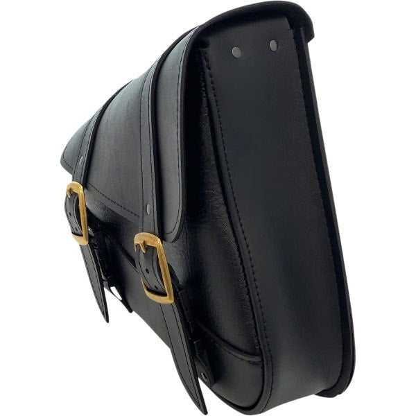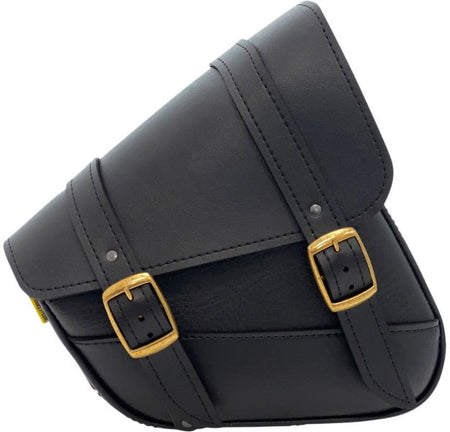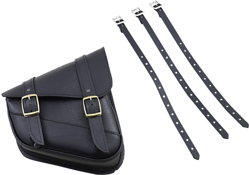 - Synthetic leather swingarm bag mounts easily to motorcycle with three leather straps