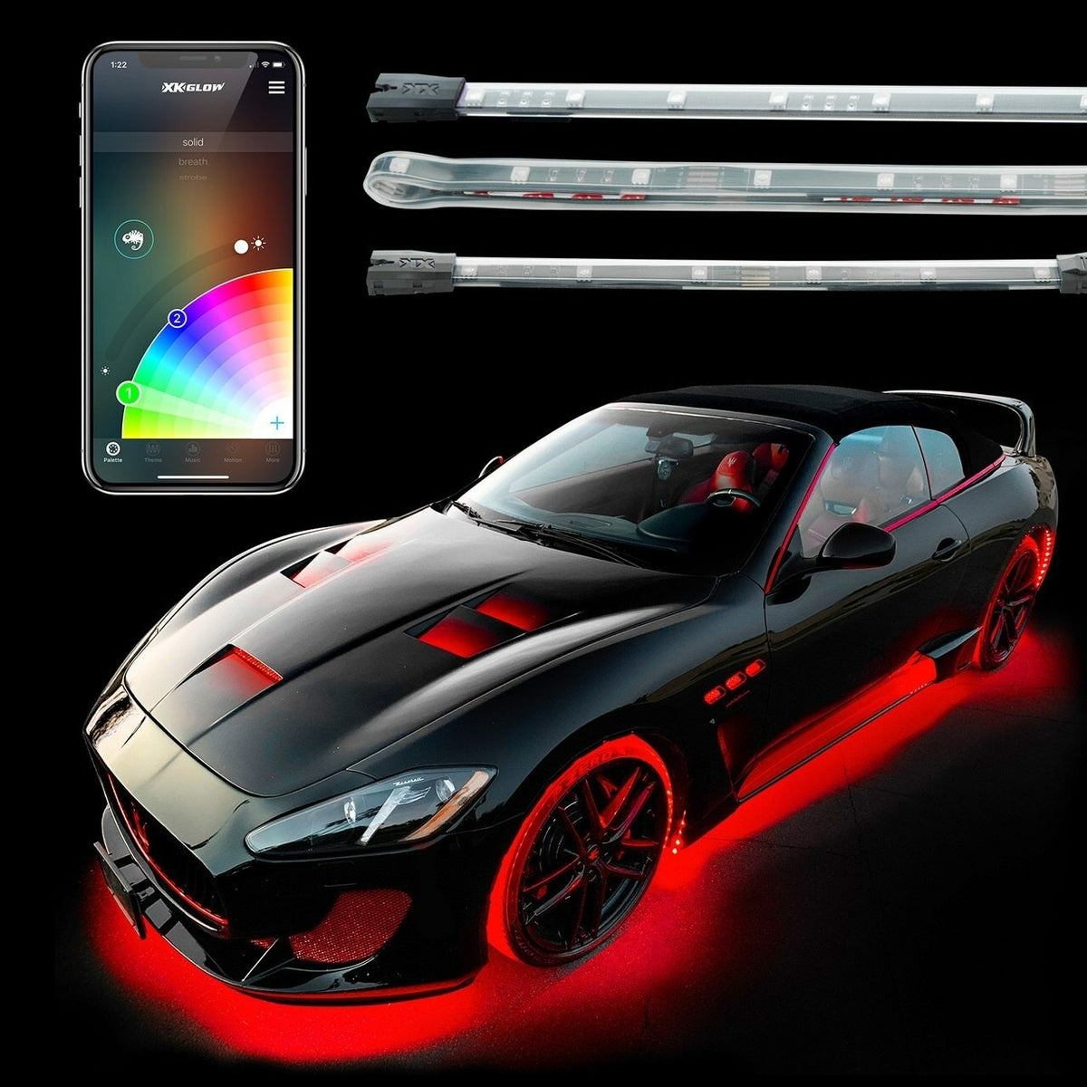LED Accent Light Kits are the brightest way to customize your ride. Kits include waterproof LED strip lights with premuim RGB LEDs for bright, vibrant colors. The kits are controlled with our industry-leading XKchrome Smartphone App Controller with millions of colors to choose from, a Themes builder, Music sync, and so much more. Install is plug and play after mounting the lights to get you back up and running in no time. Light up your ride today!Â